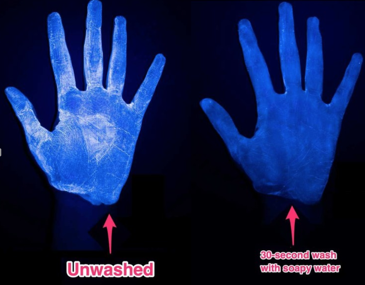 위 사진은 씻기 전의 손(왼쪽)과 비누와 물로 30초간 씻은 후의 손을 보여주고 있습니다.