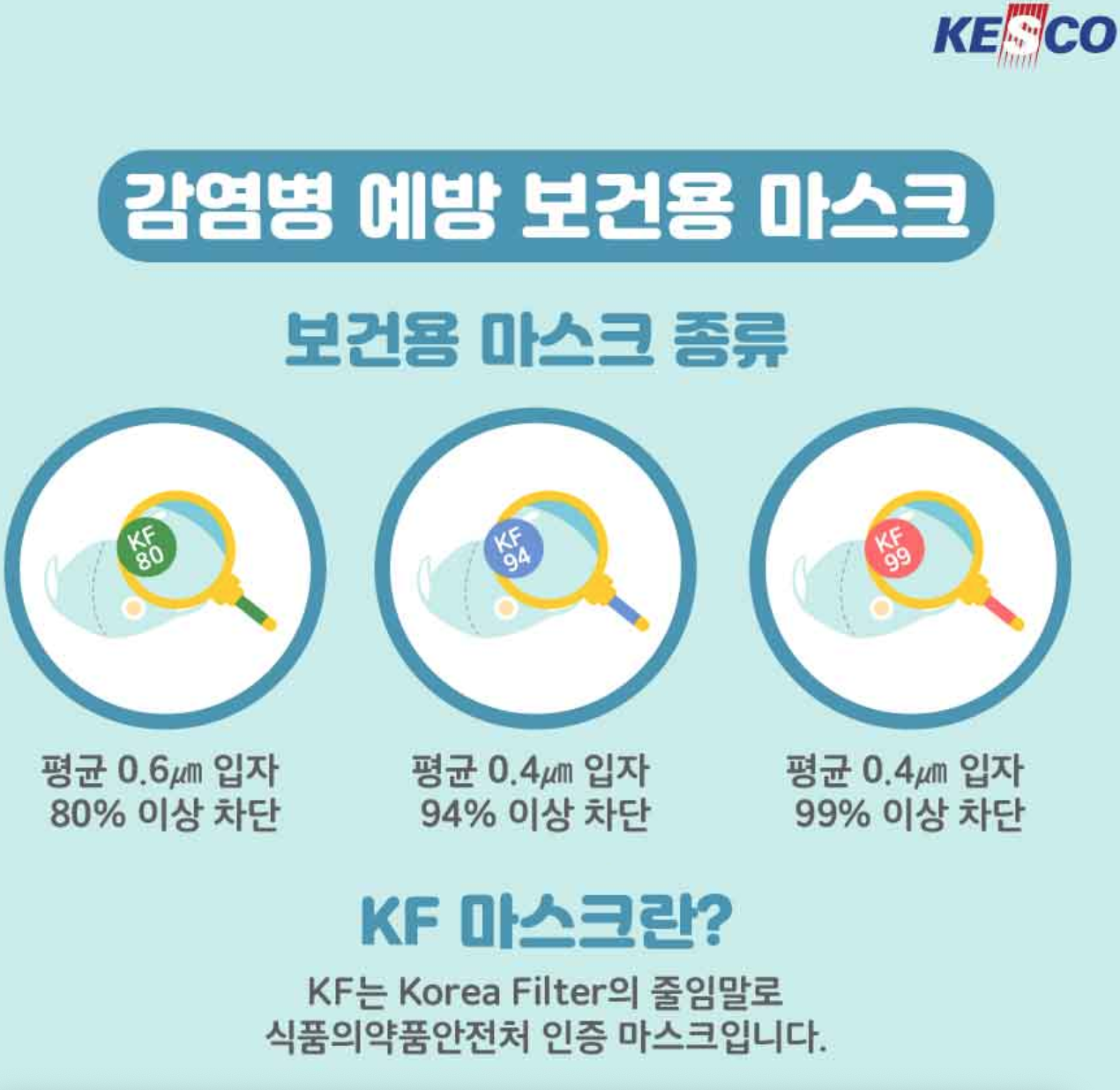마스크에는 모두 'KF+숫자' 로 표기되어 있습니다. KF는 Korea Filter의 줄임말로 식품의약품안전처에서 인증한 제품임을 뜻합니다.