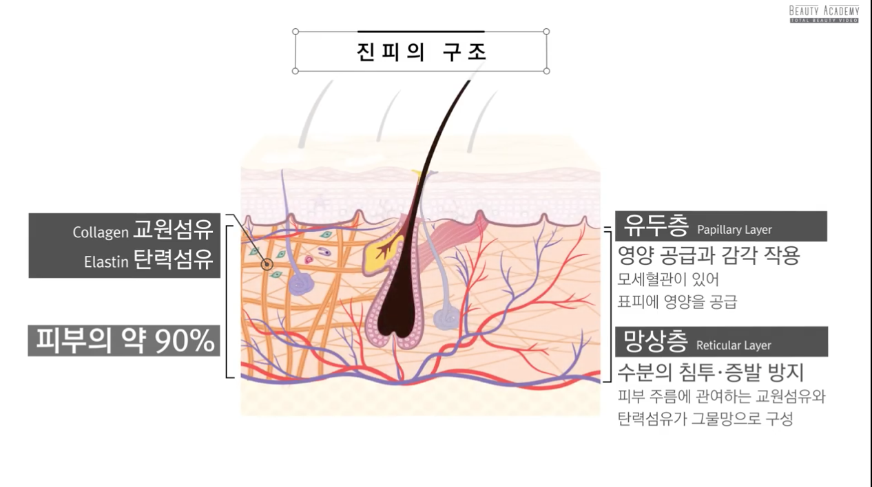 진피는 피부의 약 90%를 차지하며, 피부의 윤기, 탄력, 지지작용을 해주는 중요한 역할을 합니다.