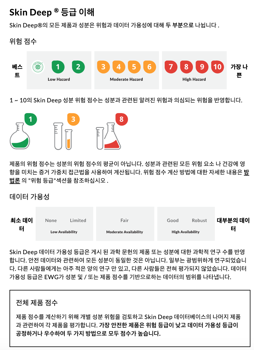 이곳에서 운영하는 아래 사이트에서 EWG 등급에 대해 제공하며, 화해 앱과 같이 제품을 검색할 수 있습니다.